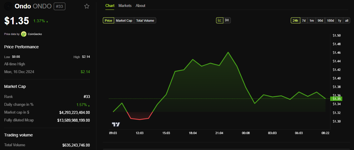Namun, meskipun ada berita ini, reaksi terhadap token Ondo Finance cukup tenang. Data BeInCrypto menunjukkan ONDO naik sebesar 1,37% sejak sesi Rabu dibuka. Pada waktu publikasi, token ini diperdagangkan seharga US$1,35.