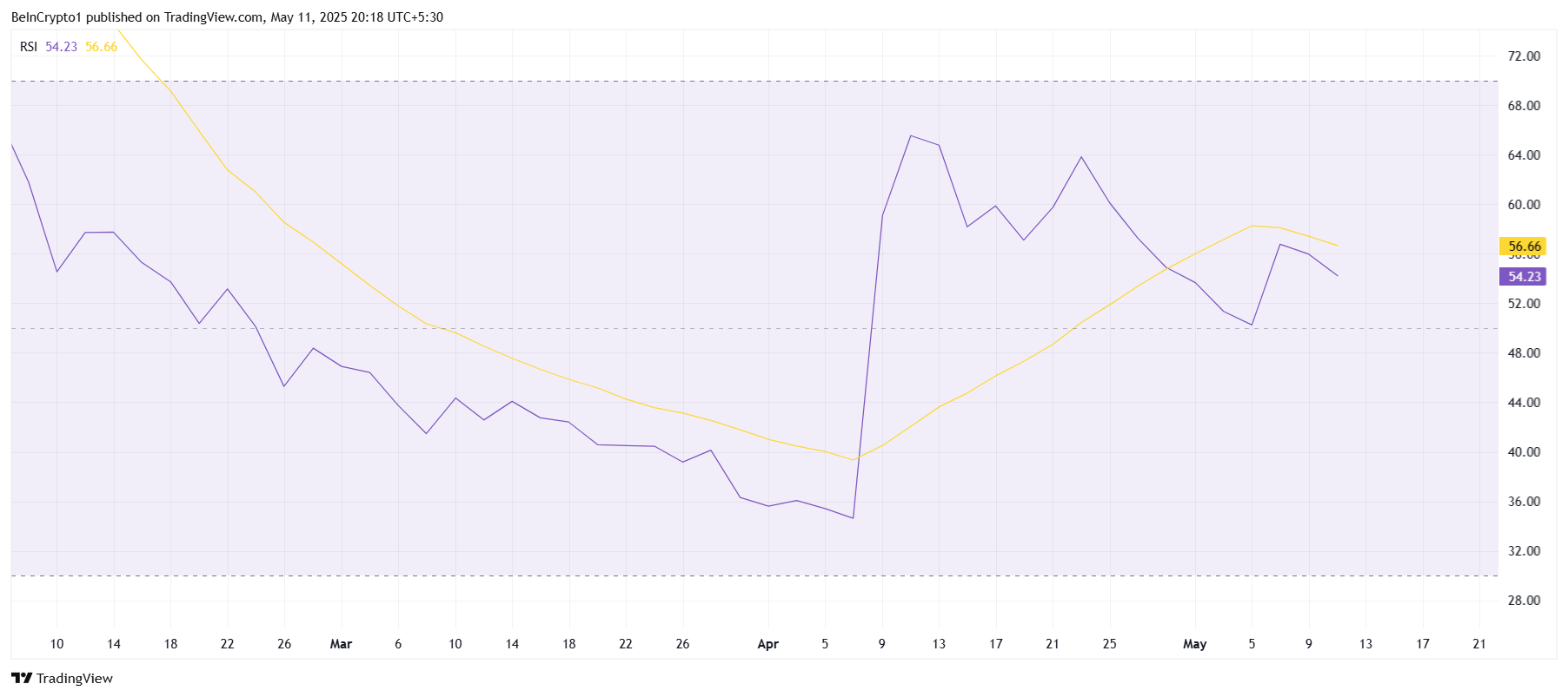 Meski ada tanda-tanda overvalued, Onyxcoin tidak menghadapi momentum bearish yang signifikan, seperti yang ditunjukkan oleh Relative Strength Index (RSI)-nya. Saat ini, RSI berada di atas angka netral 50,0, menunjukkan bahwa meskipun pasar kurang menguntungkan, XCN masih berada di zona harga positif.