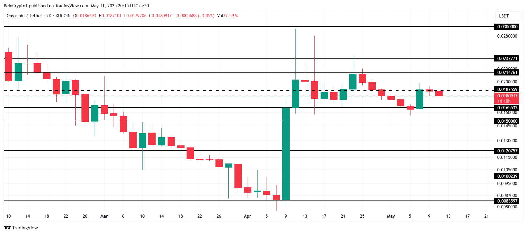 Harga Onyxcoin saat ini diperdagangkan pada US$0,0180, berkonsolidasi antara US$0,0214 dan US$0,0165. Kurangnya momentum bullish dalam beberapa minggu terakhir membuat harga tidak naik di atas US$0,0214, mencerminkan keraguan pasar.