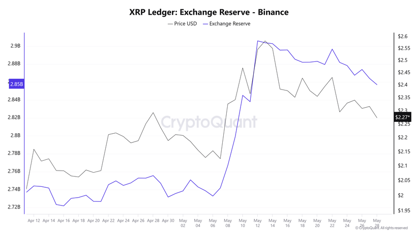 Cadangan XRP di exchange sempat meningkat tajam di awal bulan. Namun dalam dua pekan terakhir, cadangan ini menyusut hingga 50 juta XRP atau setara lebih dari US$114 juta.
