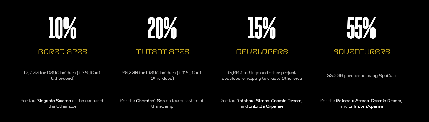 Penjualan koleksi NFT Otherdeed dari metaverse Otherside yang dikembangkan Yuga Labs mirip dengan The Sandbox dan Decentraland yang menawarkan kepemilikan tanah virtual di metaverse. Menurut rencana, akan ada total 200.000 koleksi NFT Otherdeed.