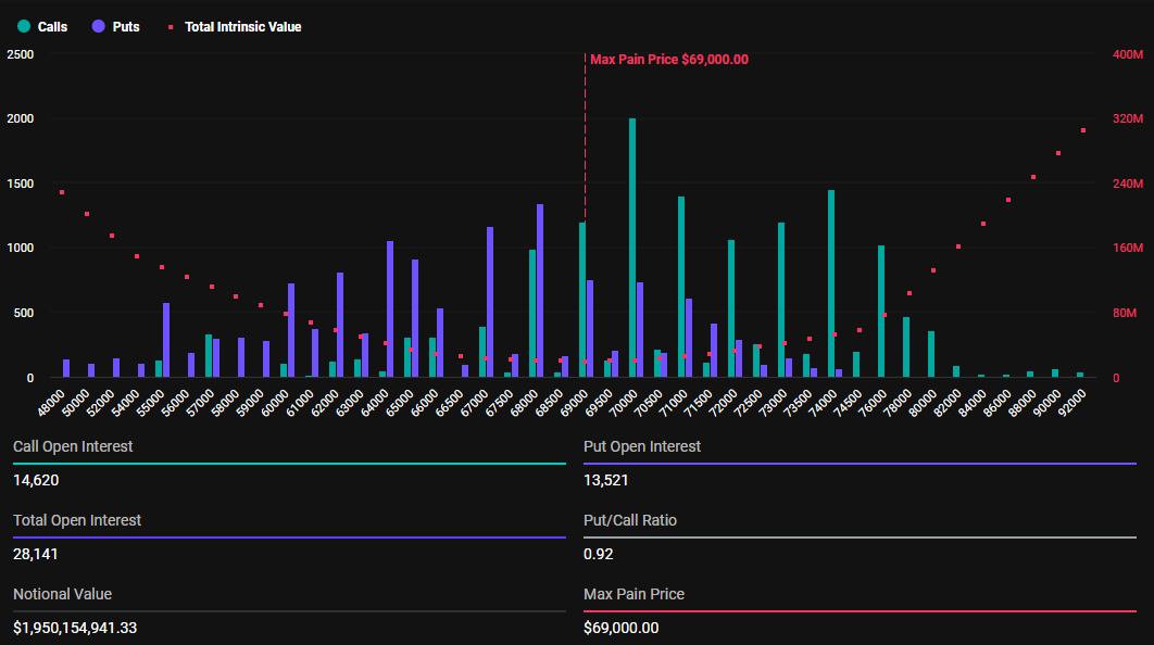 Opsi Bitcoin ini memiliki harga max pain di US$69.000 dan rasio put-to-call sebesar 0,92. Dengan rasio di bawah 1, ini menunjukkan sentimen bullish meskipun BTC turun 4%. Sebagai perbandingan, opsi Ethereum memiliki harga max pain di US$2.550 dan rasio put-to-call 0,69, mencerminkan pandangan pasar yang serupa.