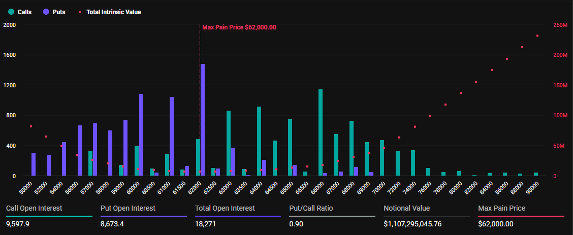 Terdapat peningkatan signifikan dalam kontrak Bitcoin (BTC) dan Ethereum (ETH) yang akan kedaluwarsa hari ini dibandingkan minggu lalu. Data dari Deribit menunjukkan 18.271 kontrak opsi Bitcoin akan kedaluwarsa dengan rasio put-to-call 0,90 dan titik max pain sebesar US$62.000.