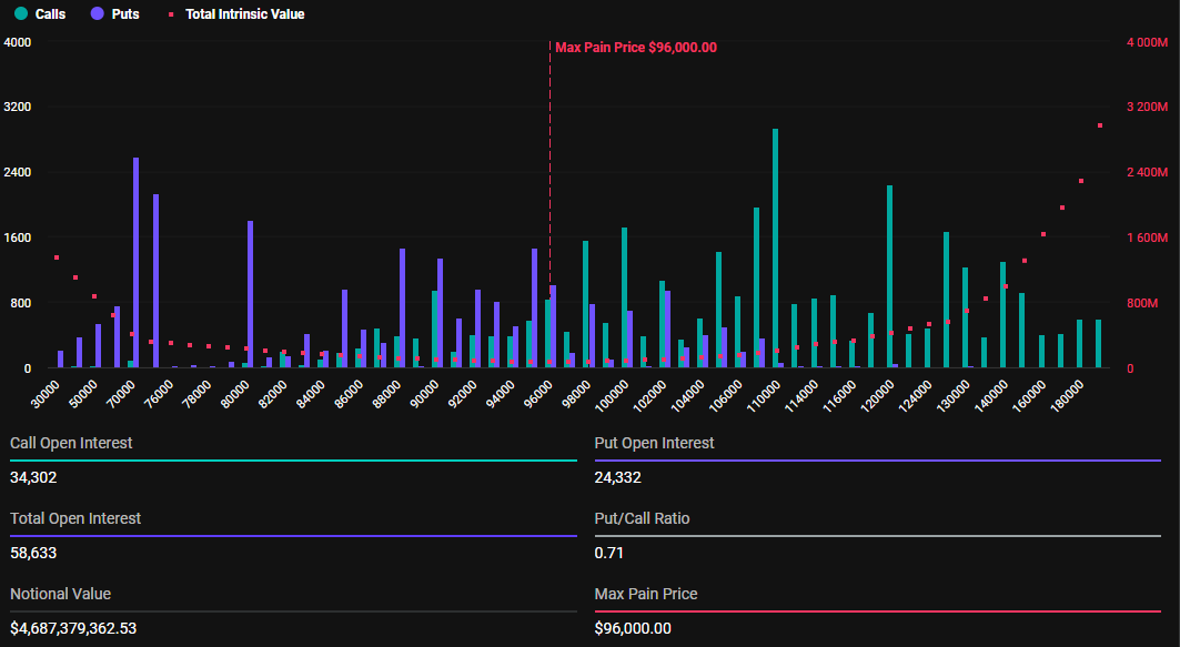 Nilai nominal dari opsi BTC yang kedaluwarsa hari ini adalah US$4,68 miliar. Menurut data Deribit, 58.633 opsi Bitcoin yang kedaluwarsa ini memiliki rasio put-to-call 0,71. Rasio ini menunjukkan prevalensi opsi pembelian (call) dibandingkan opsi penjualan (put).