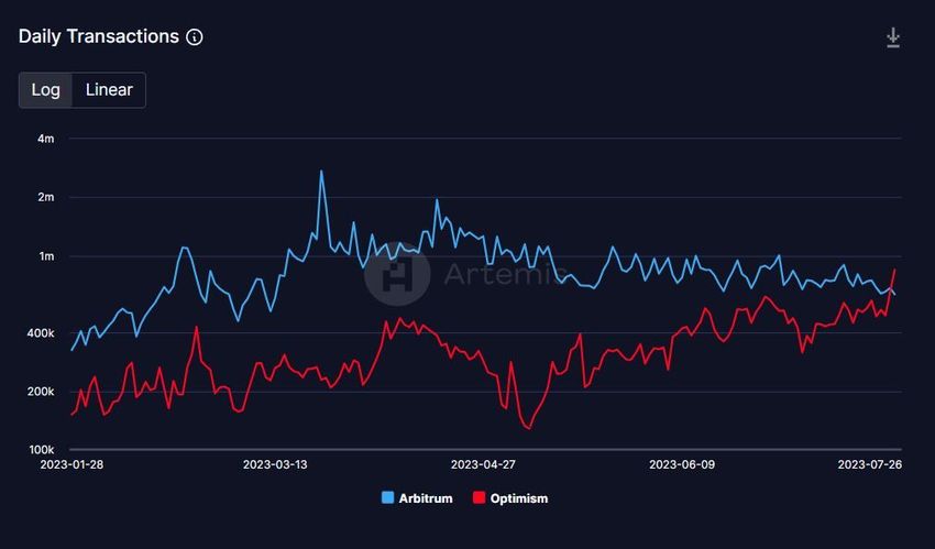 Pada tanggal 27 Juli, penyedia metrik on-chain Artemis mengungkapkan bahwa Optimism telah berhasil menyalip Arbitrum dalam hal jumlah transaksi harian.