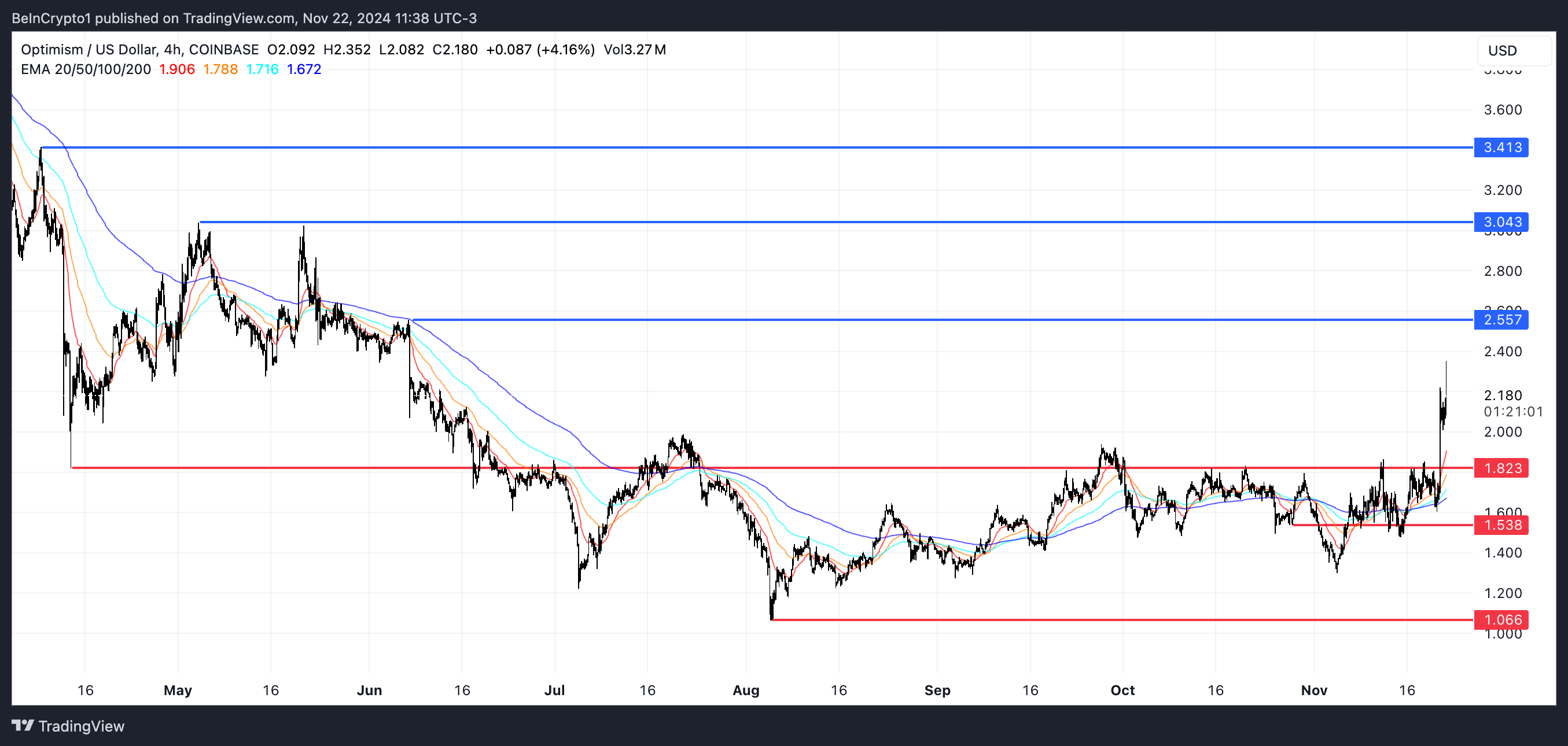 Harga Optimism (OP) telah melonjak 43,40% dalam tujuh hari terakhir, menunjukkan momentum bullish yang kuat di pasar. Tren naik ini didukung oleh kekuatan tren yang meningkat, dengan ADX mengonfirmasi momentum yang tumbuh dan garis EMA menunjukkan setup bullish.
