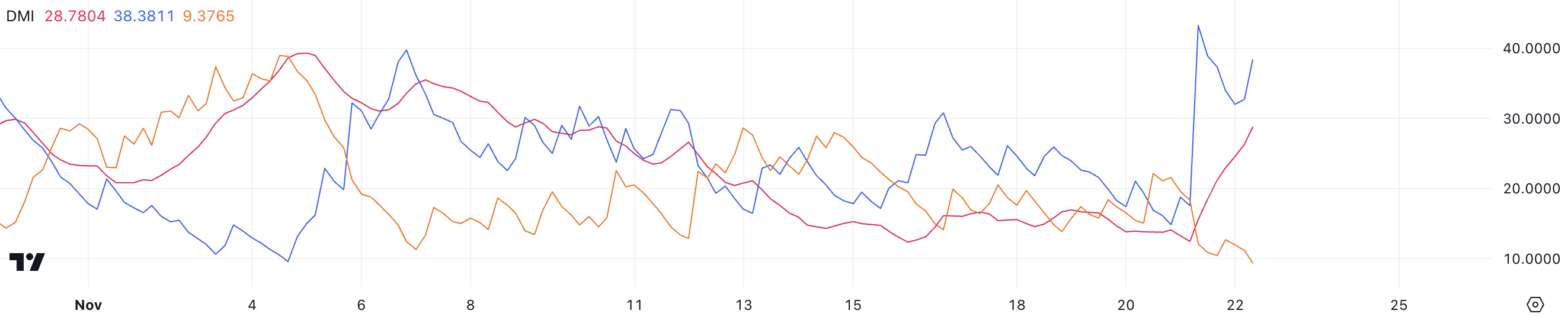 Indeks arah positif (D+) berada di 38,8, sementara indeks arah negatif (D-) berada di 9,37, menunjukkan bahwa tekanan bullish jauh melebihi aktivitas bearish. Kesenjangan besar antara D+ dan D- mencerminkan dominasi pembeli yang kuat, memperkuat tren naik.