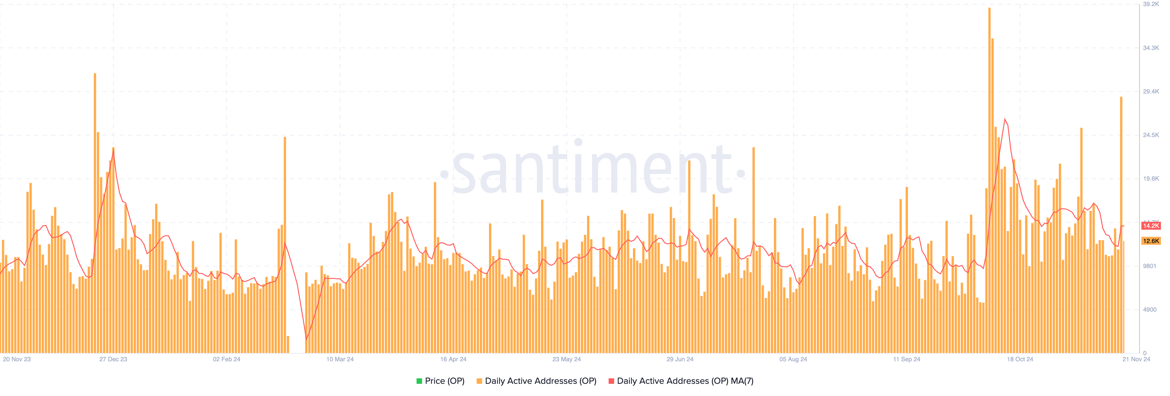 OP rata-rata pergerakan 7 hari dari alamat aktif harian adalah 14.200 pada 21 November.