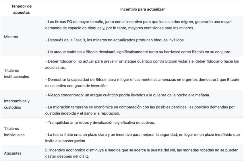 Pengembang Jameson Lopp, Christian Papathanasiou, Ian Smith, Joe Ross, Steve Vaile, dan Pierre-Luc Dallaire-Demers mengusulkan soft fork dalam proposal bertajuk Post-Quantum Migration and the Demise of Legacy Signatures. Mereka sepakat bahwa Bitcoin belum pernah menghadapi ancaman eksistensial semasif ini.