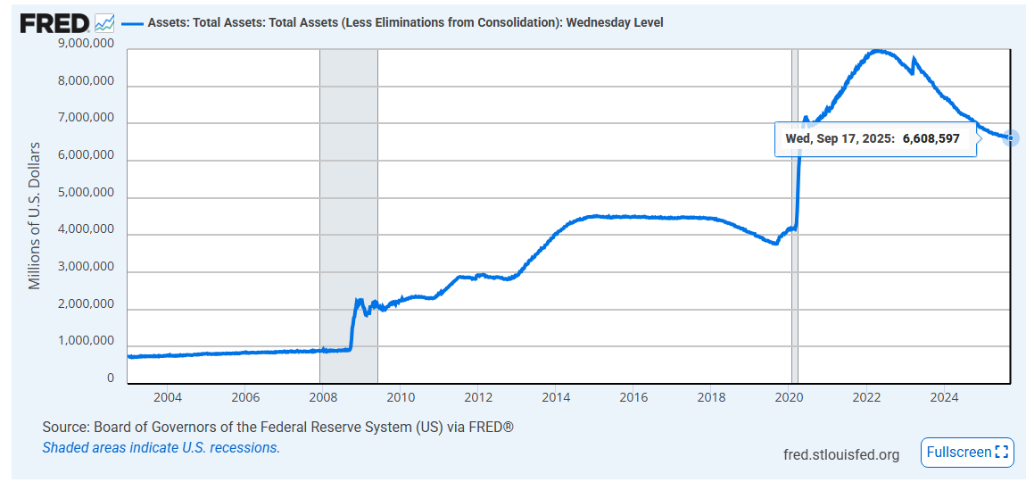 Terlebih lagi, meskipun The Fed memangkas suku bunga, data neraca keuangan The Fed menunjukkan bank sentral tersebut sebenarnya belum agresif memperluas likuiditas. Karena jika mengacu pada rilis mingguan H.4.1 Federal Reserve, total aset The Fed per 17 September 2025 tercatat sebesar USS$6,608 triliun.