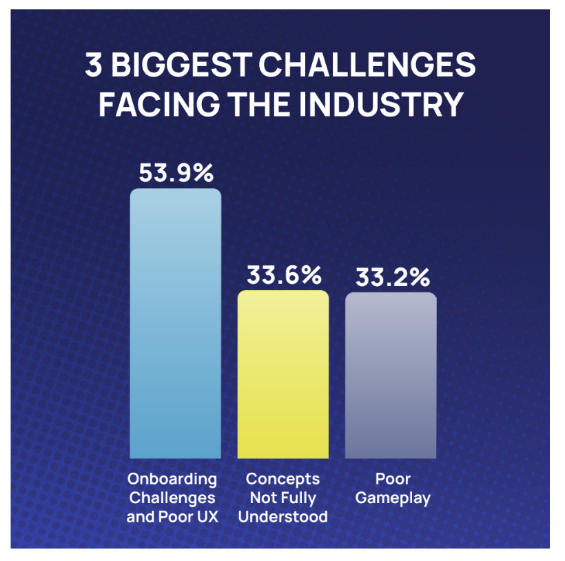 Menurut laporan 2024 Blockchain Game Alliance (BGA) berdasarkan 623 tanggapan, 53,9% responden menunjukkan bahwa onboarding dan pengalaman pengguna (UX) yang buruk tetap menjadi tantangan utama dalam game blockchain.