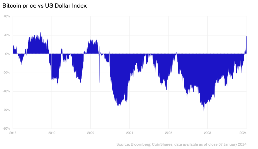 Dinamika inflasi di negara-negara maju yang mirip dengan tren pasca tahun 2009 menunjukkan kemungkinan penurunan suku bunga oleh The Fed. Adapun pelonggaran moneter semacam ini bisa meningkatkan daya tarik Bitcoin pada tahun 2024 dibandingkan dengan Treasury AS, terutama karena sifat pasokan Bitcoin yang tetap.