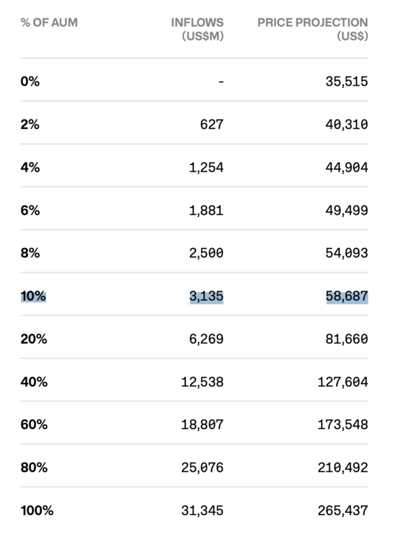 Di sisi lain, para analis CoinShares memprediksi bahwa arus masuk 10% dari aset yang dikelola (assets under management/AUM) saat ini dapat mendorong harga BTC mendekati target US$60.000.