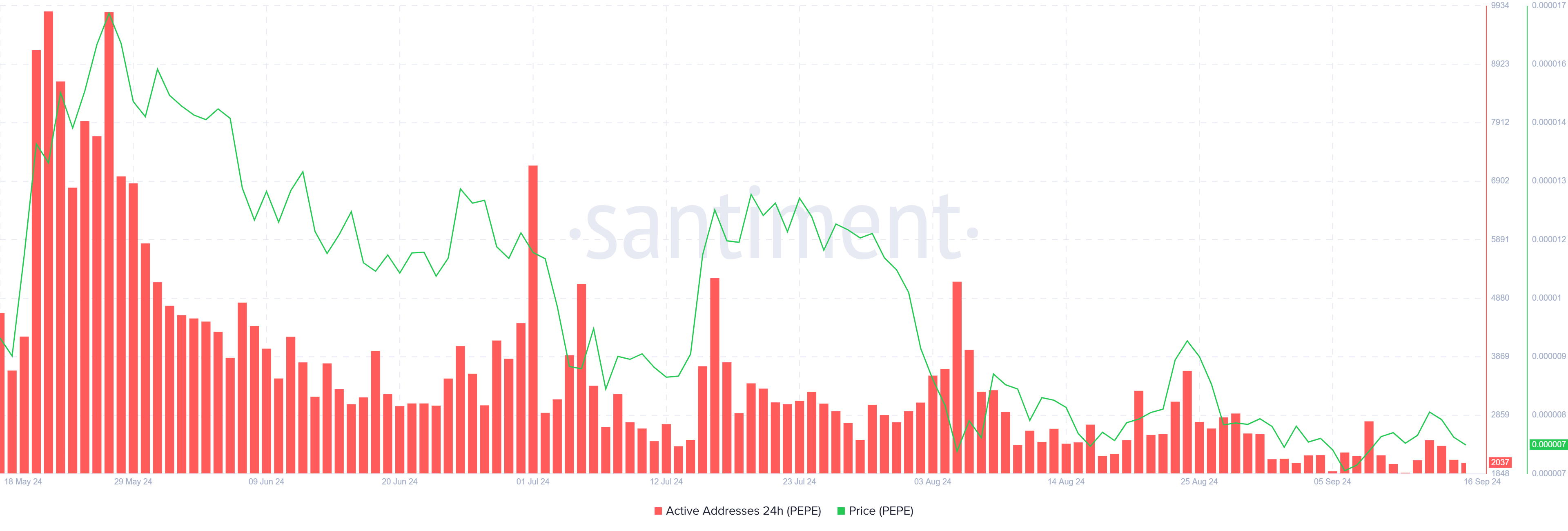 Meskipun ada optimisme dari investor besar, pasar yang lebih luas menunjukkan tanda-tanda skeptisisme. Partisipasi di jaringan PEPE terus menurun, dengan hanya lebih dari 2.000 alamat yang berpartisipasi saat ini. Penurunan aktivitas jaringan ini mencerminkan kurangnya kepercayaan dan ketakutan luas akan kerugian lebih lanjut karena meme coin ini kesulitan untuk menghasilkan pertumbuhan.