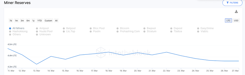 Menurut penyedia data IntoTheBlock, para miner Litecoin belakangan ini telah berbondong-bondong menjual koin mereka. Di antara tanggal 11 Maret dan 27 Maret, mereka bahkan tercatat sudah menjual hampir 1,1 juta koin senilai US$100 juta.