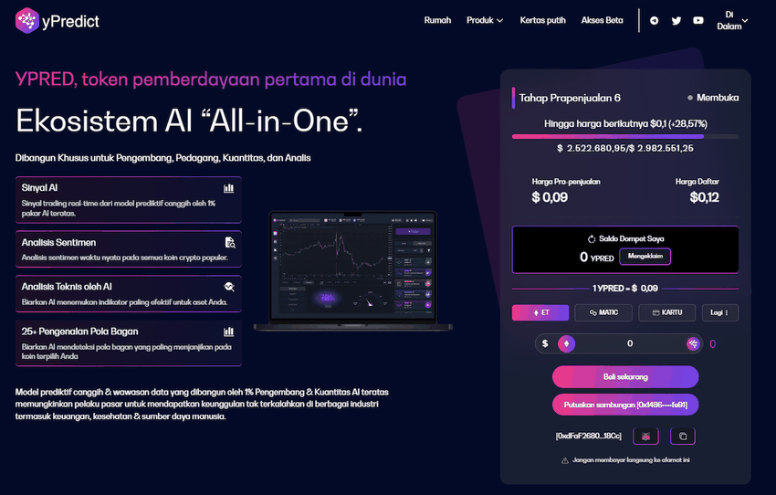 Presale saat ini berada di Tahap 6 dari 8 tahapan yang direncanakan. Artinya, token $YPRED tersedia dan dapat dibeli dengan harga US$0,09, atau 33% lebih rendah dari harga listing CEX yang direncanakan.