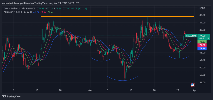 Dengan kata lain, penurunan tekanan jual dan bangkitnya kembali pasar bullish ini menandakan bahwa GMX berpeluang akan mengukir aksi harga yang kuat di awal April 2023.