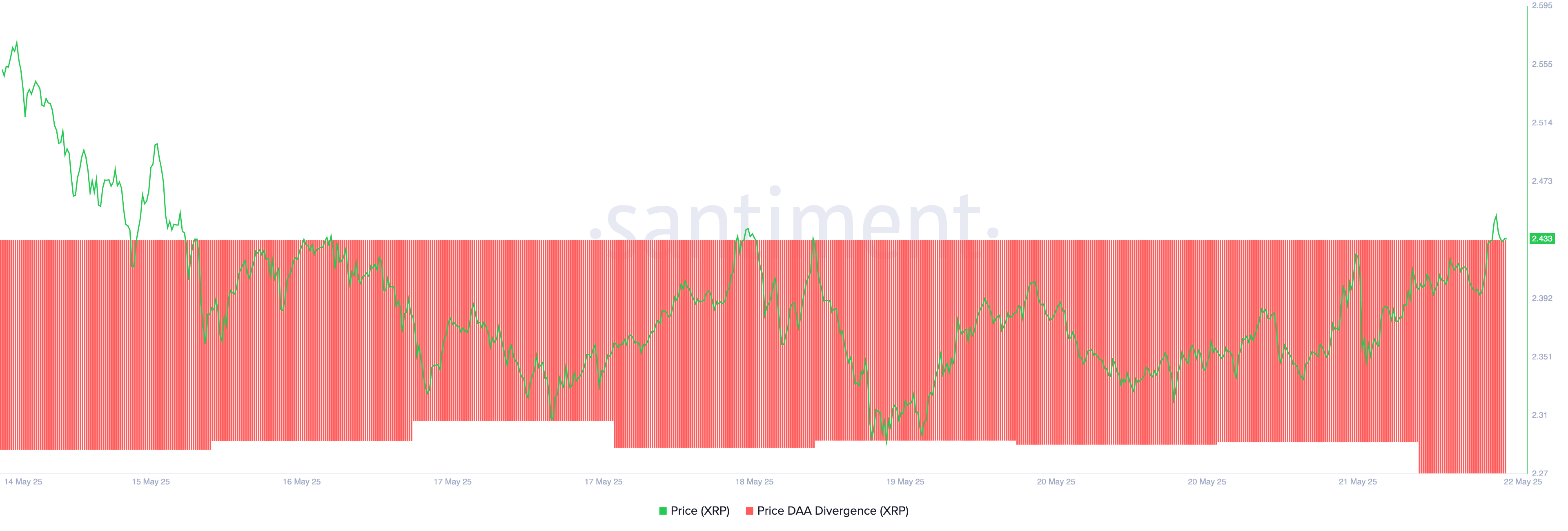 Ini juga mencerminkan sentimen bearish terhadap XRP di pasar saat ini, terutama karena menghadapi aktivitas jaringan yang lemah. Meskipun mengalami lonjakan harga 4%, Divergensi Price Daily Active Addresses (DAA) token tetap negatif, menunjukkan lemahnya permintaan di balik reli tersebut. Pada waktu publikasi, divergensi ini berada di -58,2%.