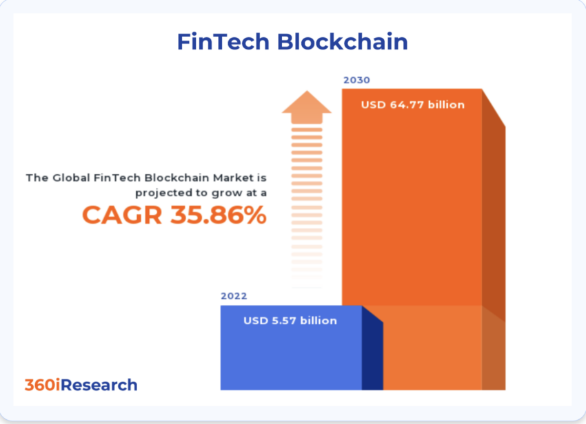 Laporan “FinTech Blockchain” menunjukkan bahwa pasar fintech blockchain global akan tumbuh sebesar US$5,57 miliar setiap tahunnya, antara tahun 2023 hingga 2030. Studi ini menekankan bahwa pertumbuhan teknologi ini akan terjadi karena memungkinkan pengelolaan operasi keuangan, pengiriman uang, perdagangan sekuritas, dan verifikasi identitas digital yang lebih efisien.