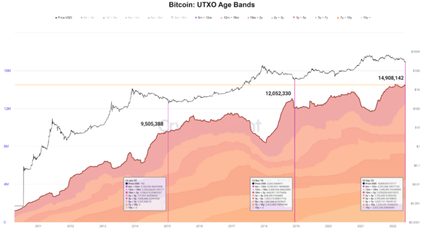 Menariknya lagi, jika kita bandingkan dengan dua periode bear market yang sebelumnya, pertumbuhan kepemilikan jangka panjang Bitcoin telah meningkat secara signifikan: