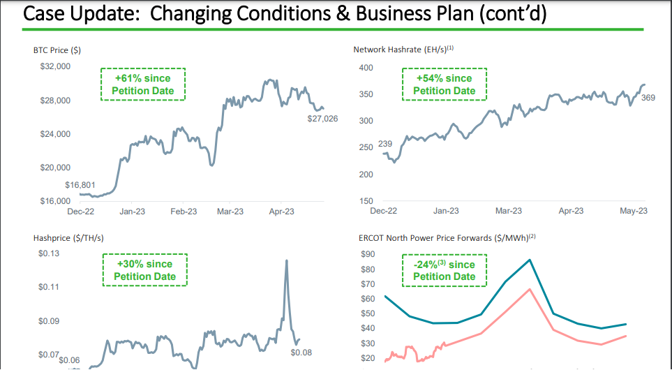 Dalam laporannya ke pengadilan kebangkrutan, dijelaskan bahwa saat ini harga Bitcoin sudah naik 61% dibanding sewaktu pengajuan kebangkrutan dilakukan pada Desember 2022. Di samping itu, laju kecepatan untuk memproduksi Bitcoin yang tercermin dalam hashrate juga sudah melesat 54% menjadi 369 EH/s, dibanding Desember 2022 yang hanya mencapai 239 EH/s.