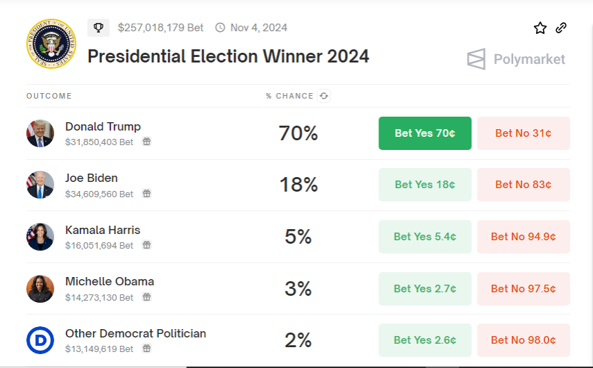 Berdasarkan data Polymarket, peluang kemenangan Trump juga sudah bergerak naik sekitar 10% menjadi 70%. Untuk dipahami, salah satu platform aset kripto itu membuat laman khusus yang memungkinkan para investor untuk melakukan taruhan dalam bentuk kripto untuk masing-masing pilihannya.