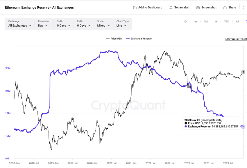Grafik Exchange Reserves dari CryptoQuant menunjukkan bahwa investor mulai memindahkan ETH milik mereka ke penyimpanan jangka panjang sesaat setelah BlackRock secara resmi mengajukan ETF Ethereum spot pada 15 November lalu.