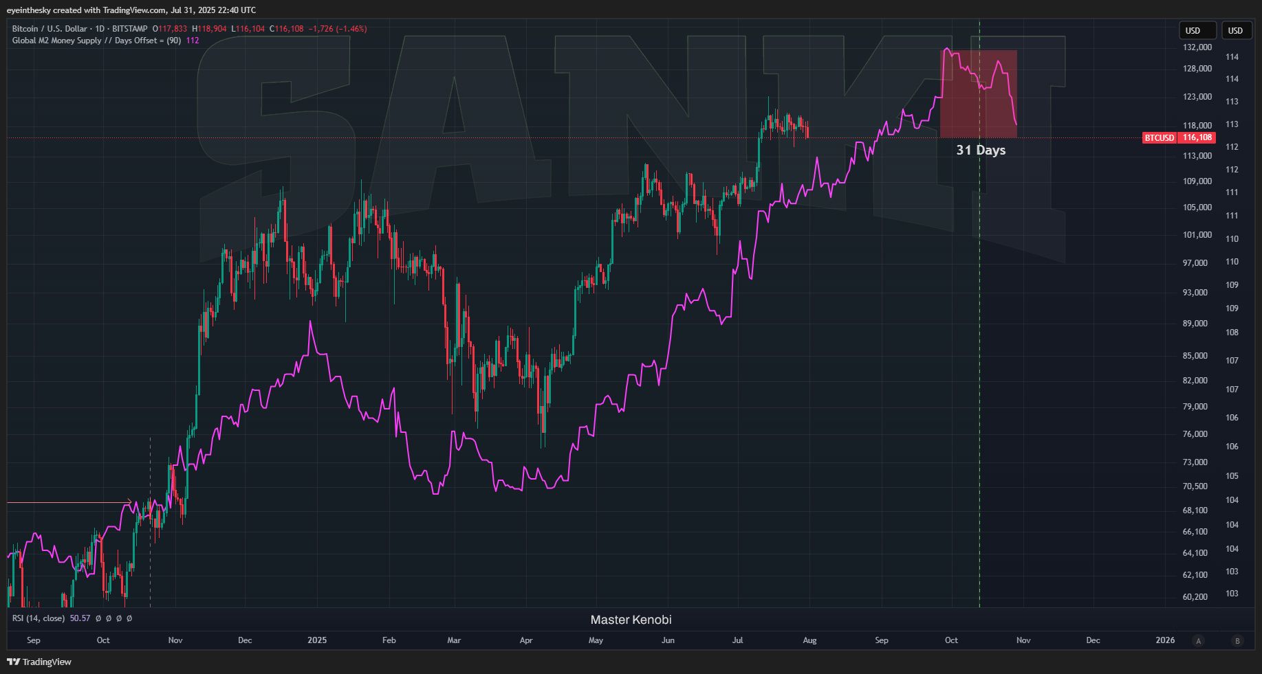 Analis Master Kenobi memberikan prediksi serupa. Dia membandingkan harga Bitcoin dengan pasokan M2 global menggunakan offset 90 hari. Berdasarkan model ini, dia memperkirakan siklus Bitcoin saat ini akan berakhir pada Oktober 2025, diikuti oleh koreksi signifikan.