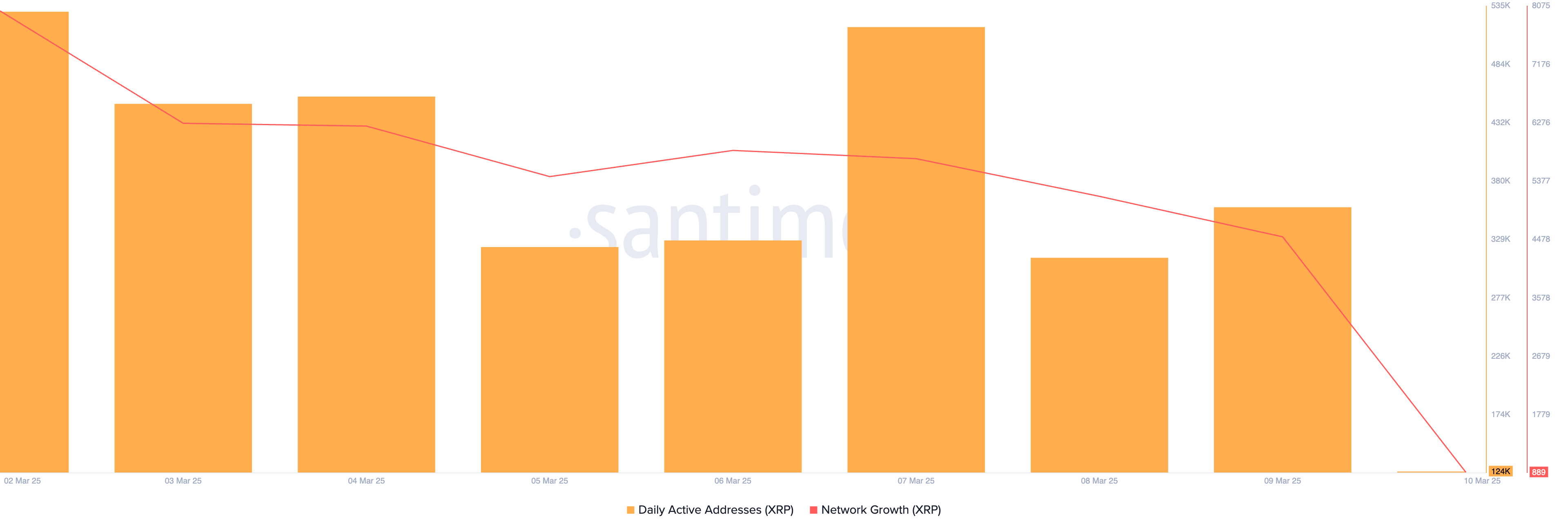 Selain itu, data on-chain juga menunjukkan penurunan permintaan baru, dengan pembelian harian XRP baru mengalami penurunan signifikan bulan ini. Menurut Santiment, hanya 4.516 alamat wallet baru yang dibuat pada hari Minggu untuk memperdagangkan XRP.