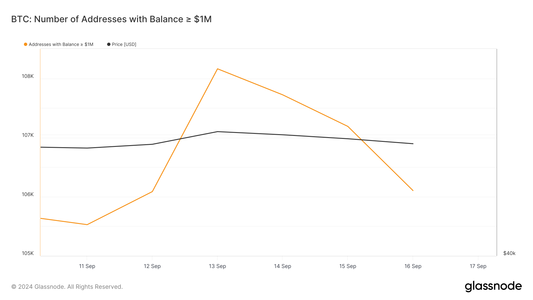 Data dari Glassnode menunjukkan bahwa para crypto whale Bitcoin menjual aset mereka menjelang pertemuan FOMC yang sangat dinantikan. Misalnya, pada tanggal 13 September, jumlah alamat yang memegang aset senilai lebih dari US$1 juta sebanyak 108.163.