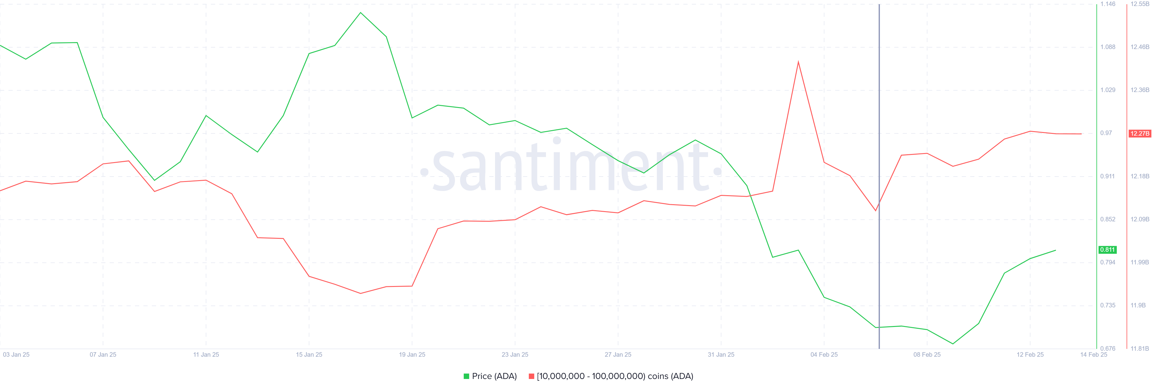Alamat yang memegang antara 10 juta hingga 100 juta ADA telah menambahkan lebih dari 170 juta ADA, senilai hampir US$136 juta, hanya dalam lima hari minggu ini. Para crypto whale ini memanfaatkan kesempatan untuk mengakumulasi pada harga rendah, menunjukkan optimisme untuk pemulihan. Keyakinan mereka terhadap pergerakan harga di masa depan dapat memberikan dukungan penting bagi harga ADA.