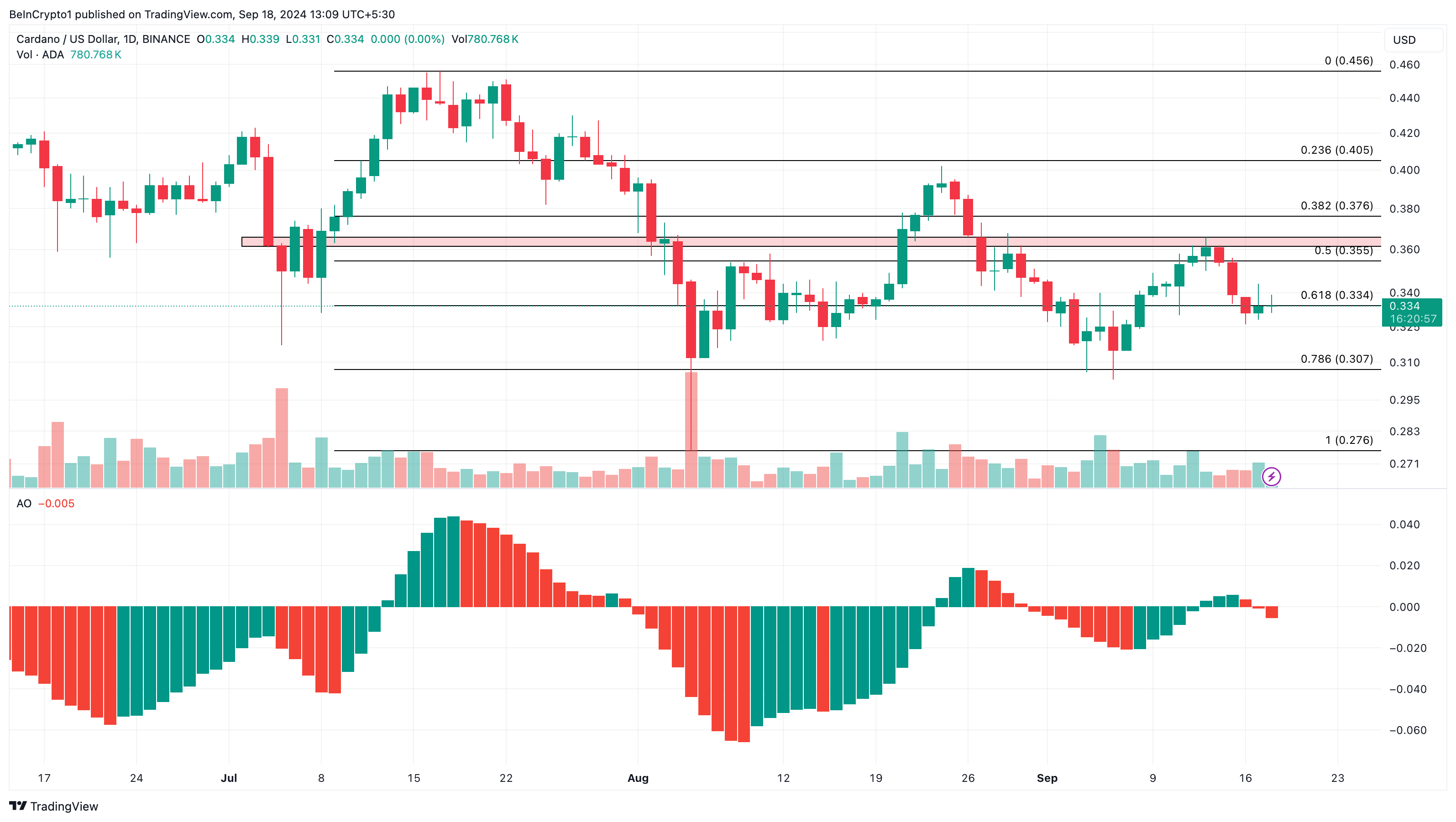 Analisis harga Cardano menunjukkan bahwa token tersebut tetap rentan terhadap isyarat bearish. Misalnya, Awesome Oscillator (AO), yang positif pada 15 September, telah turun ke wilayah negatif.