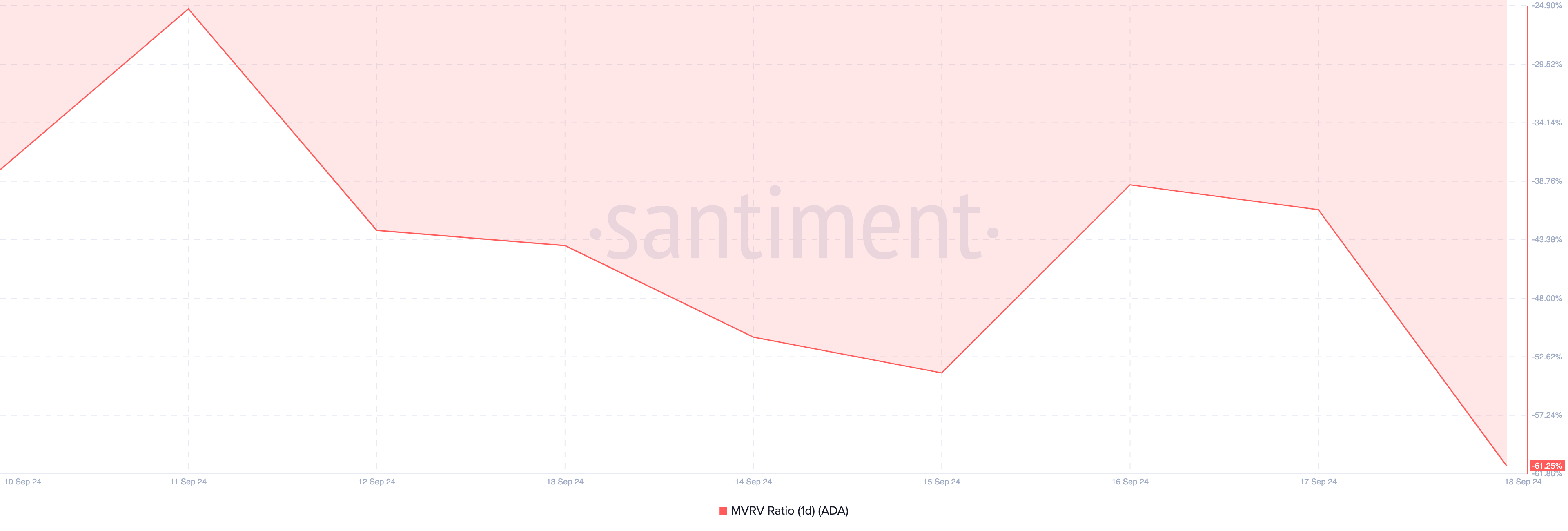 Hari ini, rasio tersebut telah menurun menjadi -61,25%, menunjukkan bahwa aksi harga ADA telah membuat lebih banyak pemegang dalam posisi yang lebih sulit untuk mencatat keuntungan.