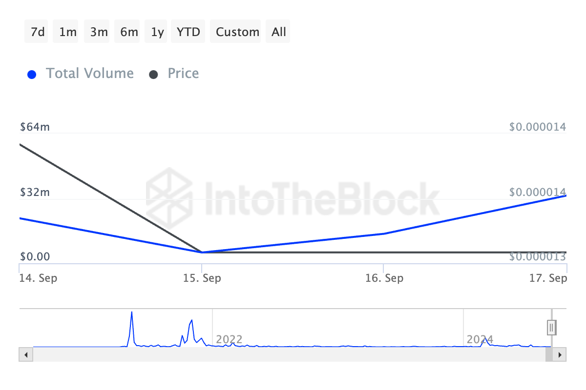 Volume transaksi besar yang melibatkan Shiba Inu telah meningkat lebih dari dua kali lipat sejak hari Minggu. Data IntoTheBlock mengungkapkan lonjakan mengejutkan sebesar 406% dalam transaksi besar -yang melebihi US$100.000- selama tiga hari terakhir.