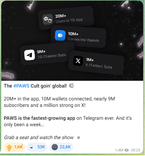 “PAWS menjadi aplikasi yang mengalami pertumbuhan tercepat di Telegram, dan hal itu hanya terjadi dalam kurun waktu 1 minggu,” klaim PAWS.