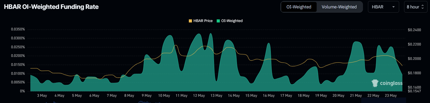 Funding rate untuk HBAR baru-baru ini melonjak, menandakan bahwa para trader optimistis dan mengharapkan kenaikan harga lebih lanjut. Peningkatan funding rate ini menunjukkan bahwa kontrak panjang mendominasi pasar, dengan para trader bertaruh pada kenaikan altcoin ini.