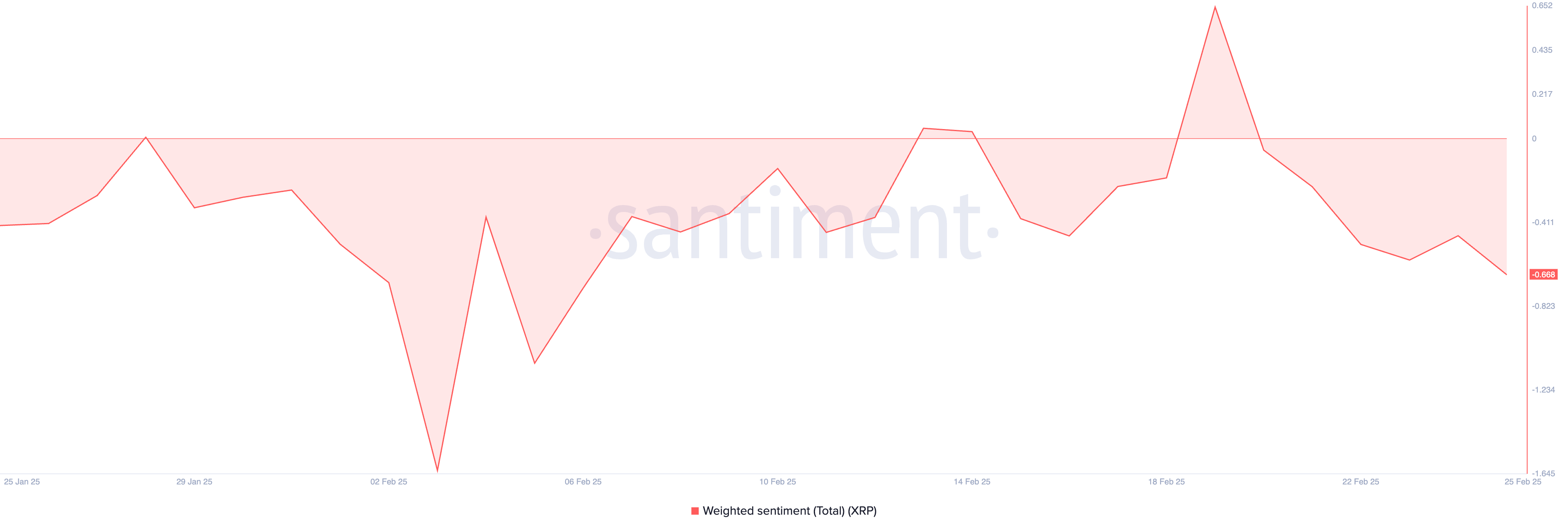 Selain itu, sentimen tertimbang negatif XRP mengonfirmasi bias bearish ini. Pada saat publikasi, metrik ini berada di bawah nol pada -0,66.