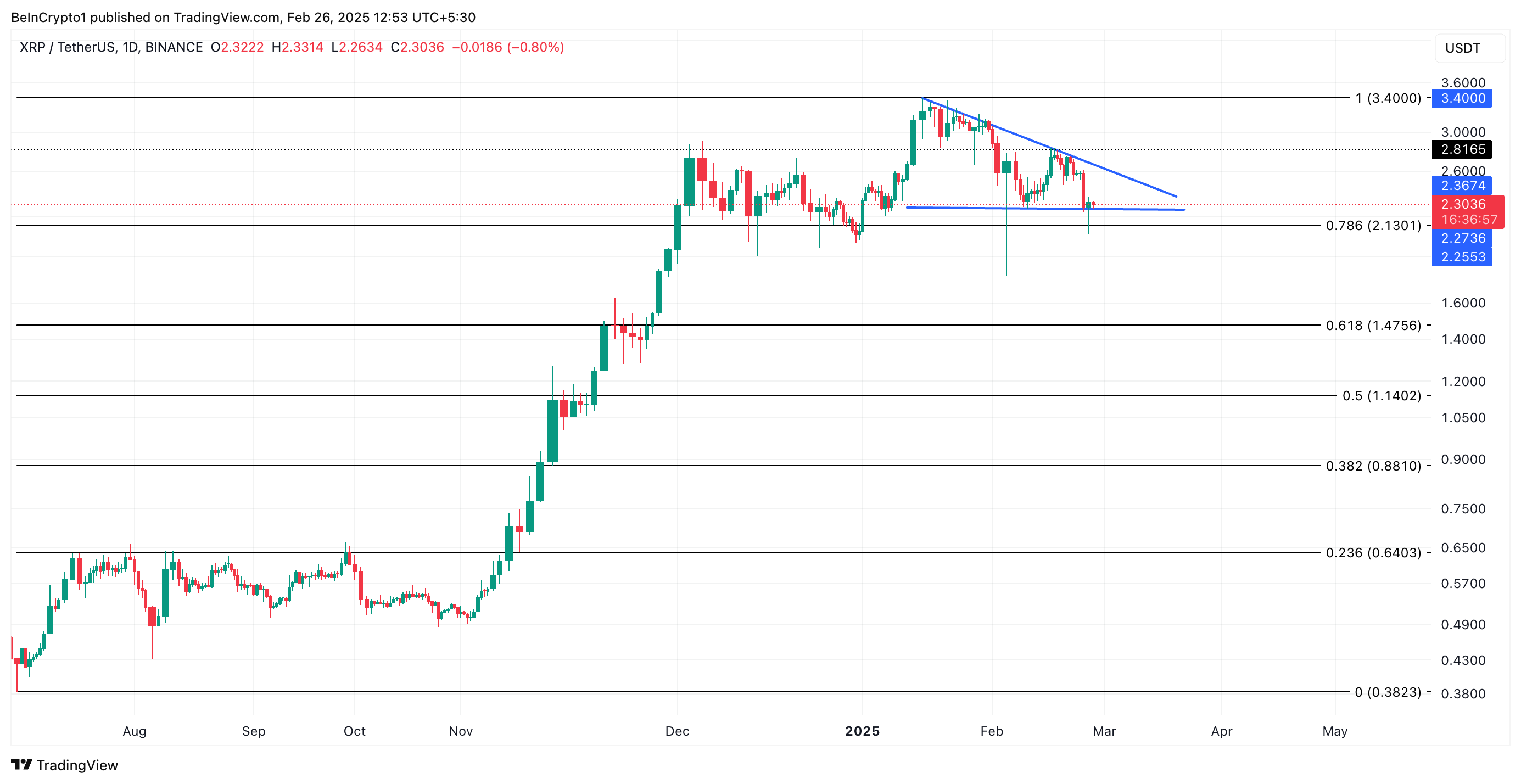 Sejak mencapai harga tertinggi sepanjang masa di US$3,40 pada 16 Januari, XRP berada dalam pola segitiga menurun. Pola bearish ini terbentuk ketika harga suatu aset menciptakan titik tertinggi yang lebih rendah sambil mempertahankan level support yang kuat, menghasilkan garis tren menurun yang bertemu dengan basis horizontal.
