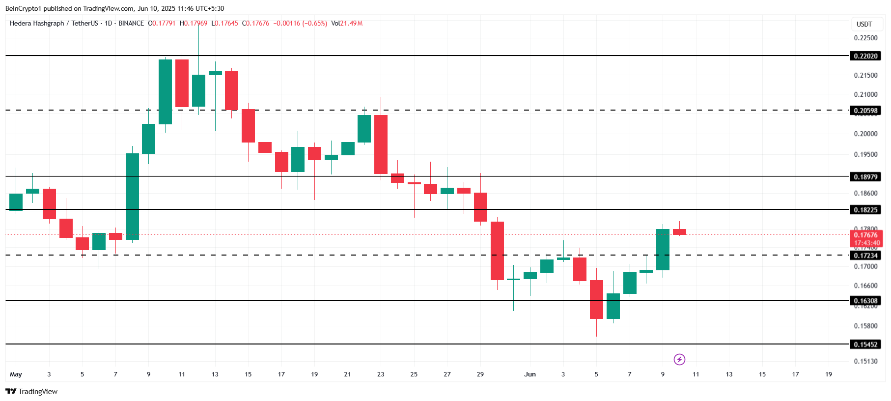 Pada waktu publikasi, HBAR diperdagangkan di US$0,176, tepat di bawah level resistance US$0,182. Crossover bullish, bersama dengan dukungan dari indikator teknis, bisa membantu HBAR menembus penghalang ini. Jika berhasil, altcoin ini kemungkinan akan terus naik, menargetkan level resistance yang lebih tinggi.