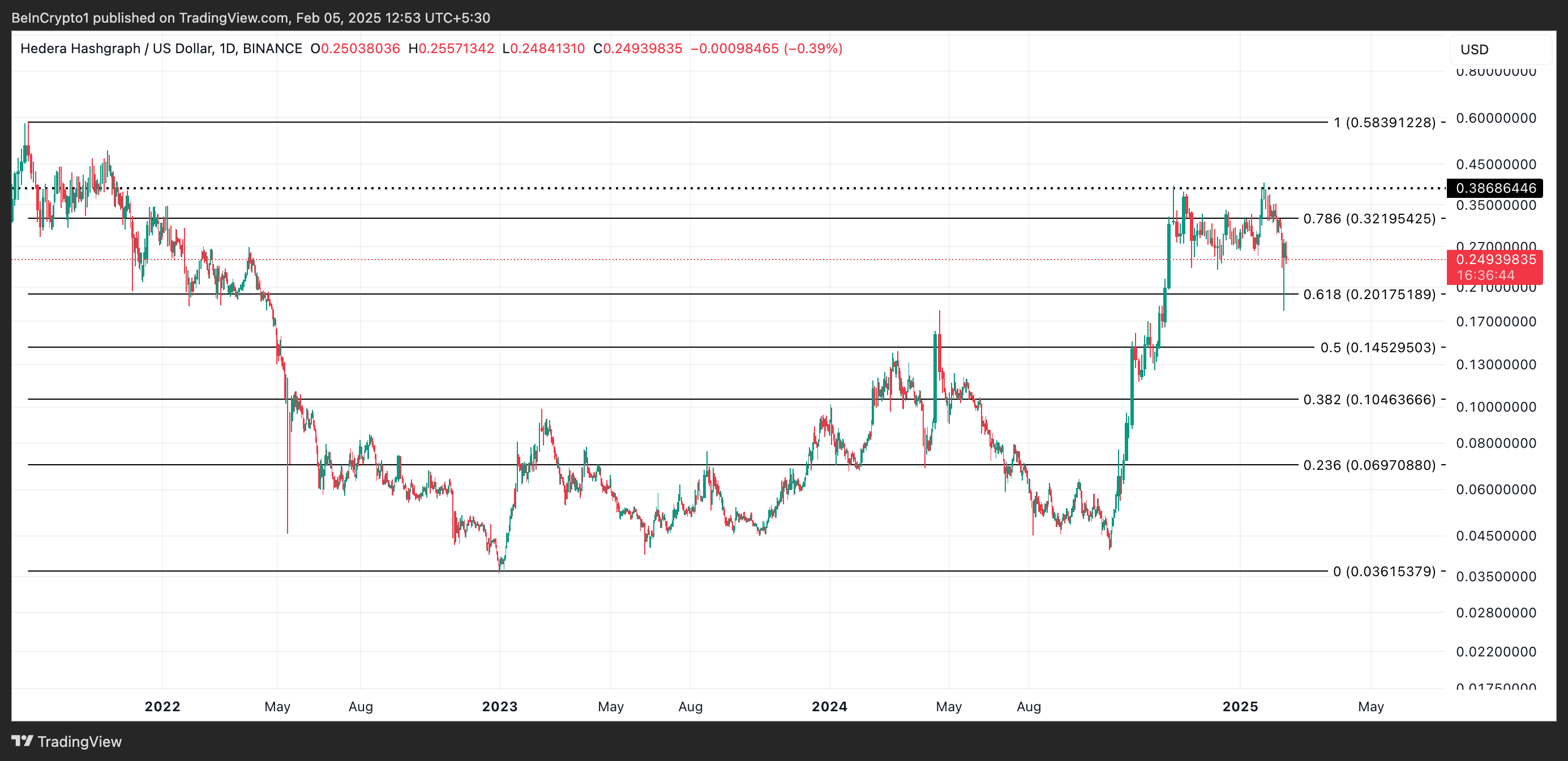 Harga HBAR kesulitan mempertahankan momentum setelah mencapai puncak empat tahun di US$0,41 pada 17 Januari. Sejak itu, token ini terus mengalami penurunan, kehilangan 39% dari nilainya.