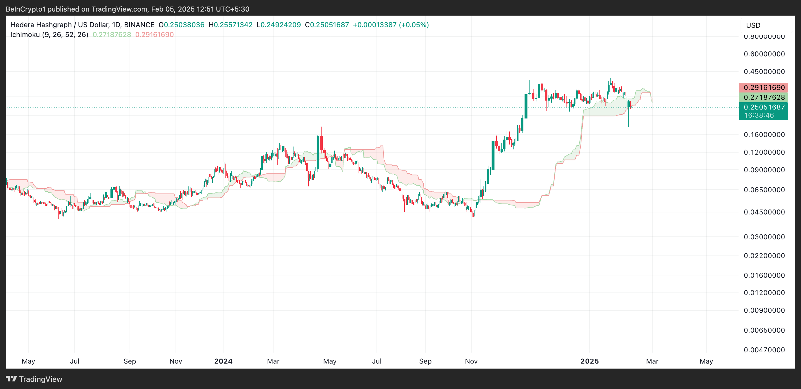 Perlu dicatat, indikator teknis memperkuat pandangan ini. HBAR diperdagangkan di bawah Ichimoku Cloud pada grafik harian, menunjukkan permintaan yang rendah dan momentum menurun.