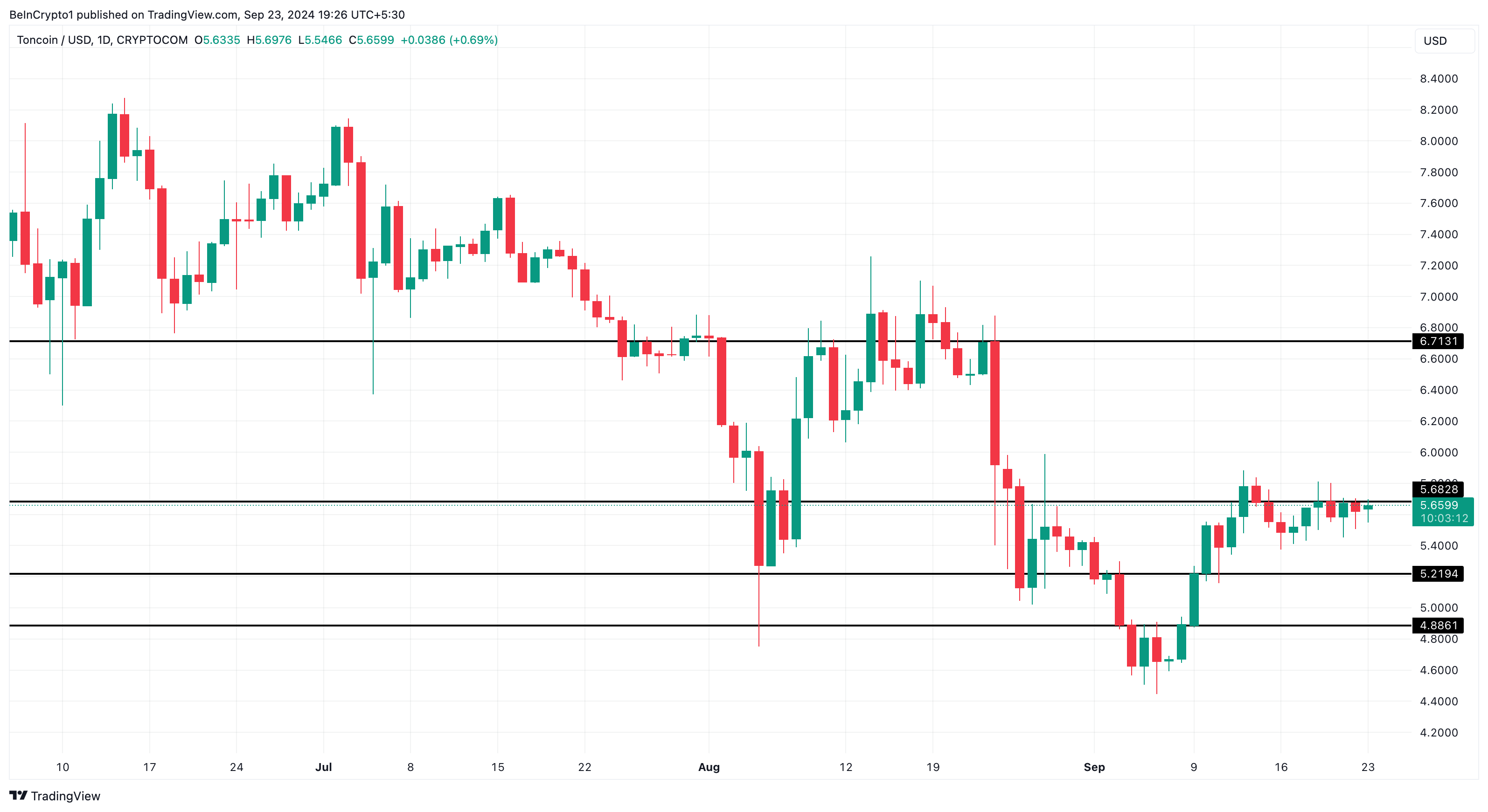 Melihat grafik harian, upaya Toncoin untuk mencapai US$6 telah terhambat oleh rintangan pada US$5,68. Level harga ini juga menghentikan gerakan serupa pada 15 September.