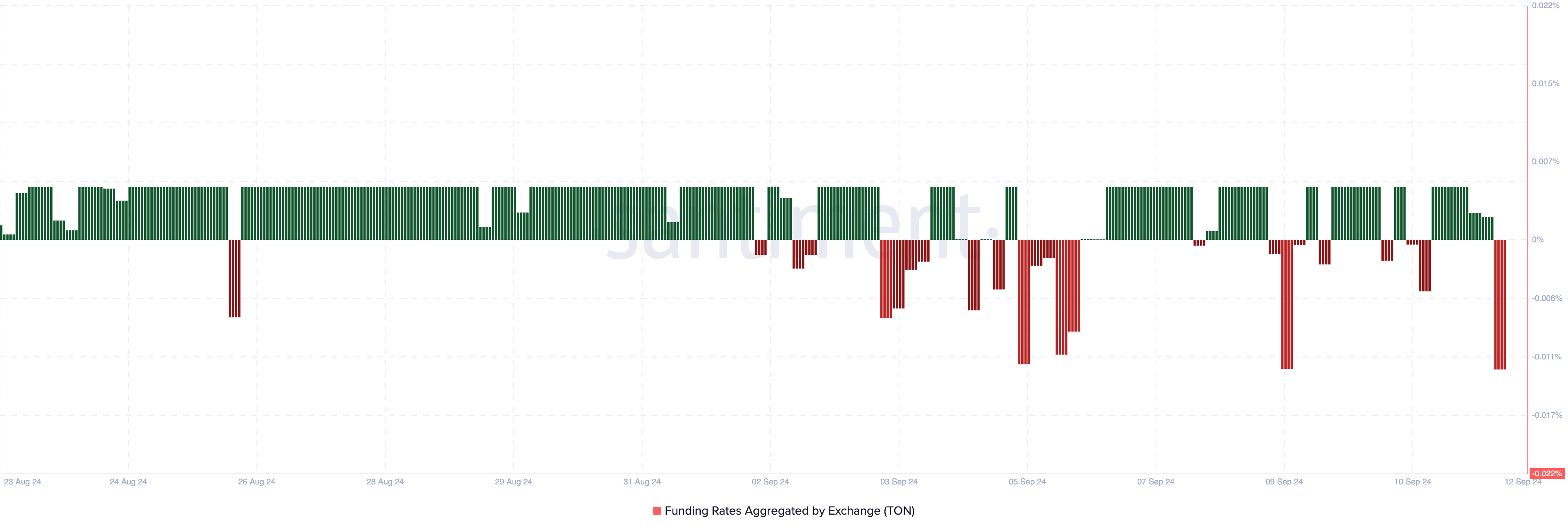 Ketika positif, para pemegang posisi long membayar kepada pemegang posisi short, menunjukkan sentimen bullish. Namun, karena rate TON negatif, para pemegang posisi short yang membayar biaya, menunjukkan bahwa para trader mengharapkan harga akan turun.