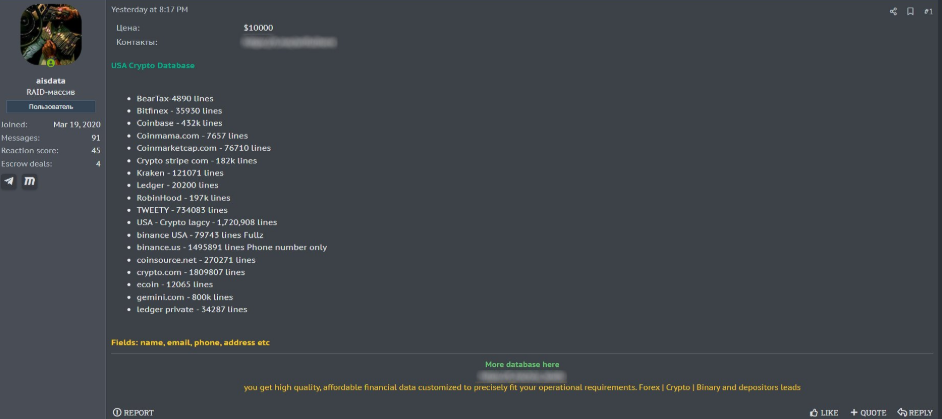 Pakar intelijen mengatakan insiden ini mungkin bagian dari penjualan dark web yang lebih besar. Menurut sumber keamanan siber, seorang aktor ancaman baru-baru ini menawarkan 18 juta catatan dari platform kripto AS.