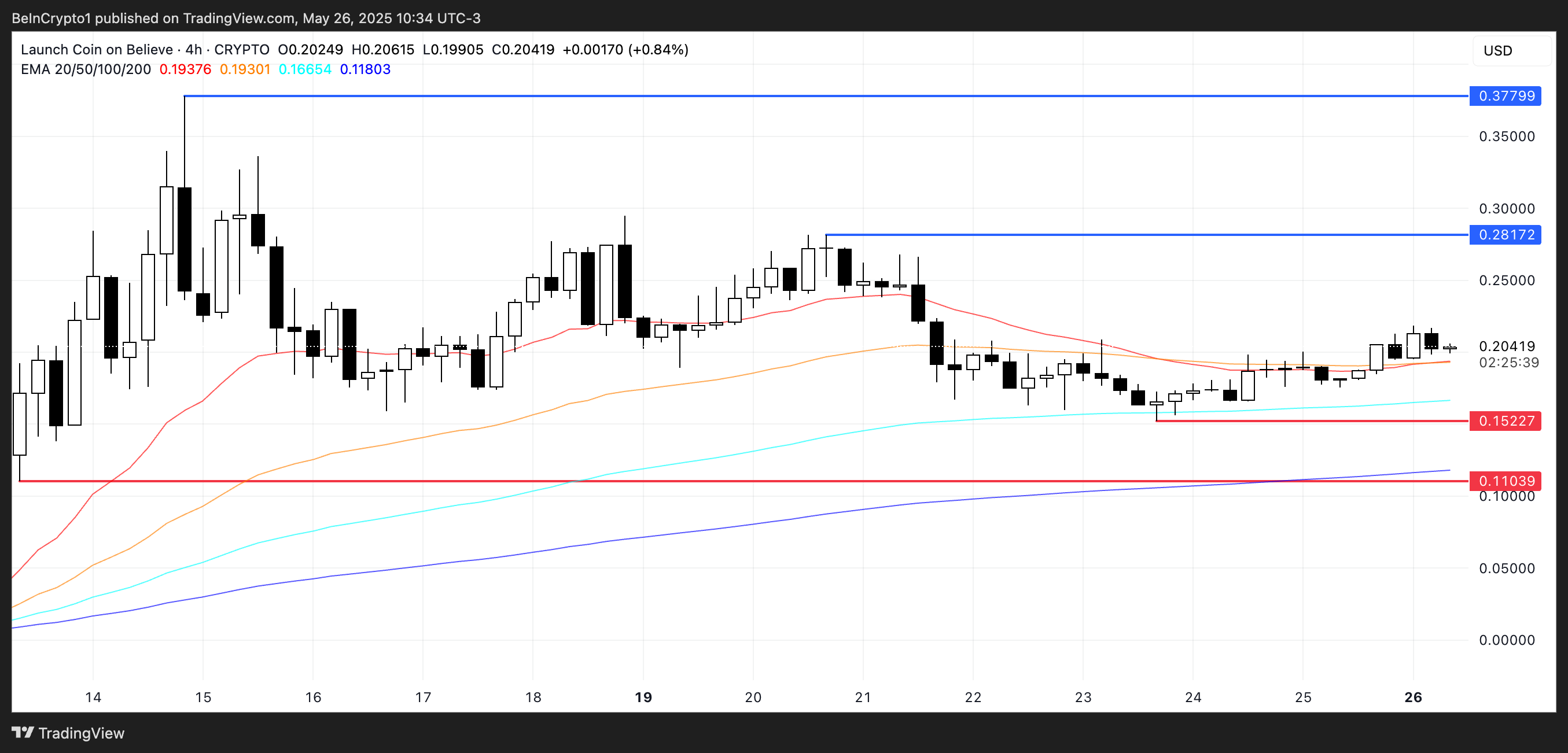 Jika momentum kembali, LAUNCHCOIN bisa mendorong menuju level US$0,28, dan breakout di atas itu bisa membuka jalan untuk bergerak setinggi US$0,377.