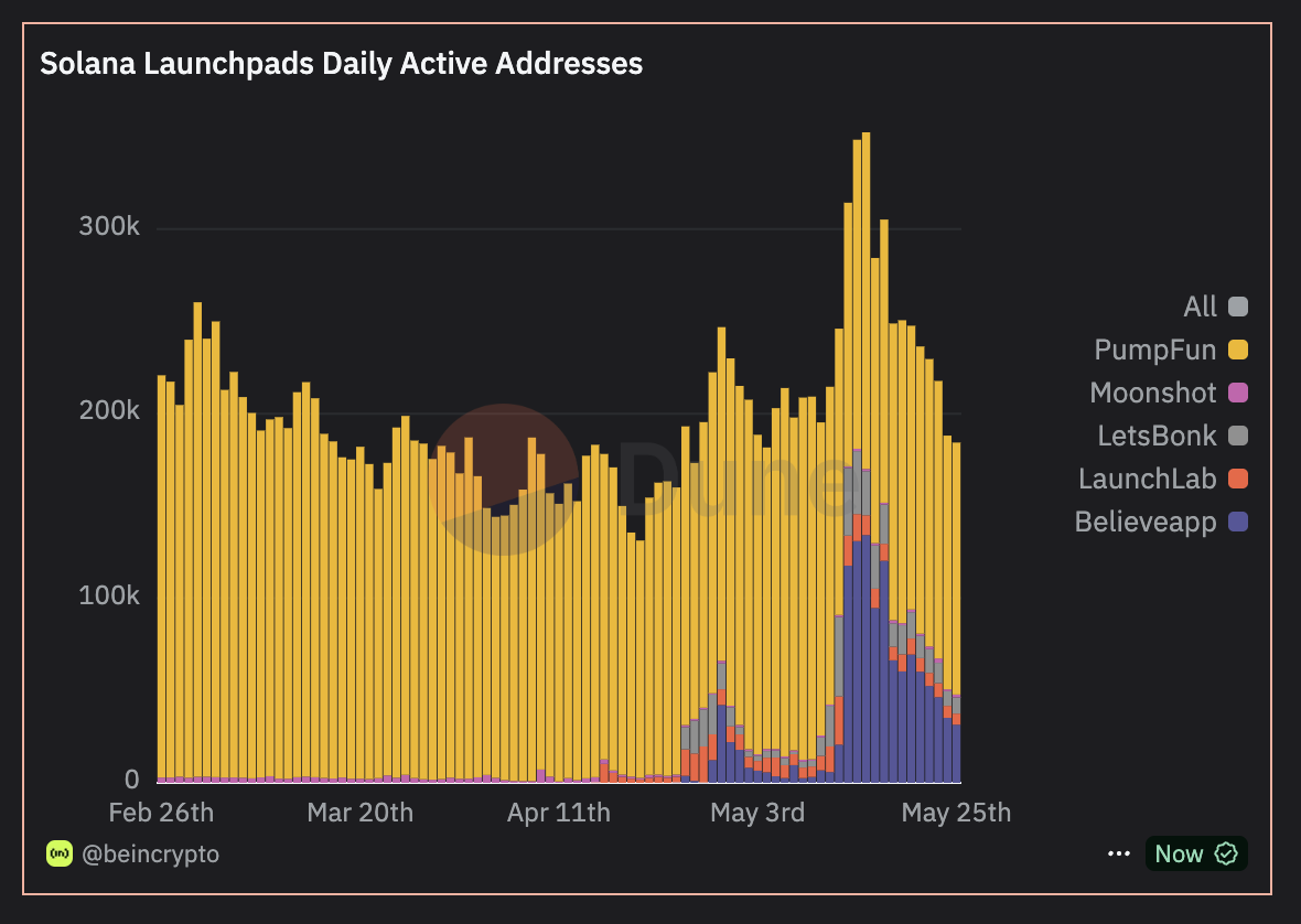 Bahkan ketika Believe mencapai puncaknya dengan 134.000 alamat aktif harian pada 15 Mei, Pump.fun tetap kuat dengan 136.519 pengguna aktif baru-baru ini pada 25 Mei, menunjukkan keterlibatan pengguna yang lebih dalam dan lebih tahan lama. Kontras antara kedua platform mencerminkan tantangan mengubah momentum viral menjadi daya tarik jangka panjang.