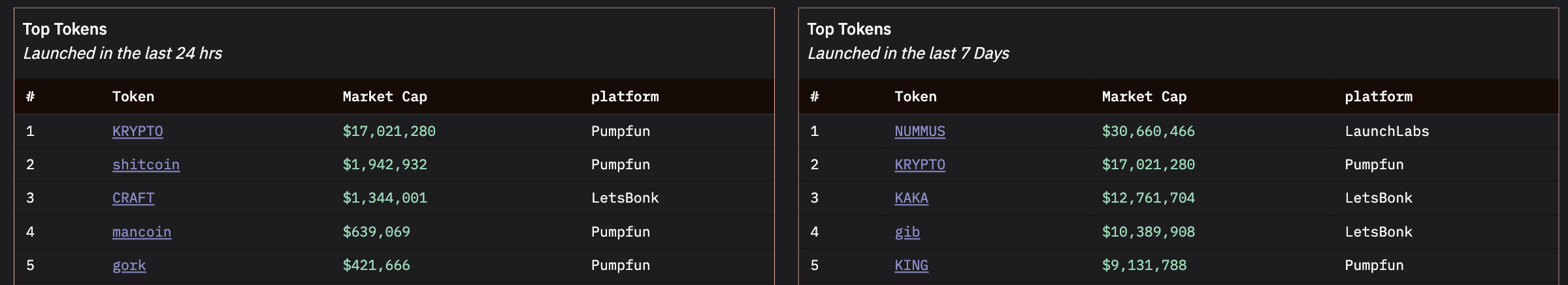 Dalam 7 hari terakhir, Pump.fun dan LetsBonk masing-masing menyumbang dua token teratas, dengan satu berasal dari LaunchLabs—meninggalkan Believe tanpa satu pun di antara para pemimpin.