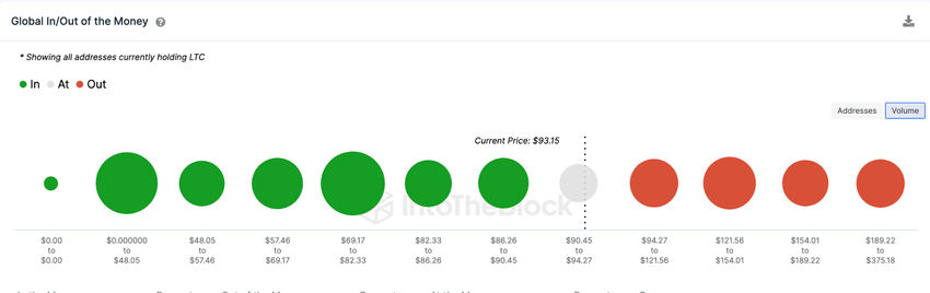 Data Global In/Out of Money (GIOM) dari IntoTheBlock menunjukkan bahwa harga LTC bisa mencapai US$120 menjelang agenda halving yang akan datang.