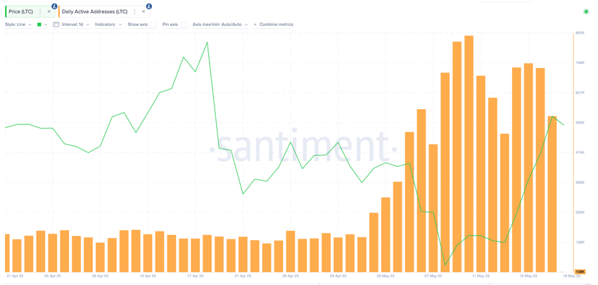 Bukan tanpa alasan, ribuan pengguna baru bergegas mengikuti tren LTC-20, sehingga mendorong aktivitas jaringan Litecoin mencapai level yang belum pernah terjadi sebelumnya. Bahkan, menurut data on-chain dari Santiment, jumlah Alamat Aktif Harian atau Daily Active Addresses (DAA) Litecoin telah melonjak lebih dari 200% pada bulan Mei.