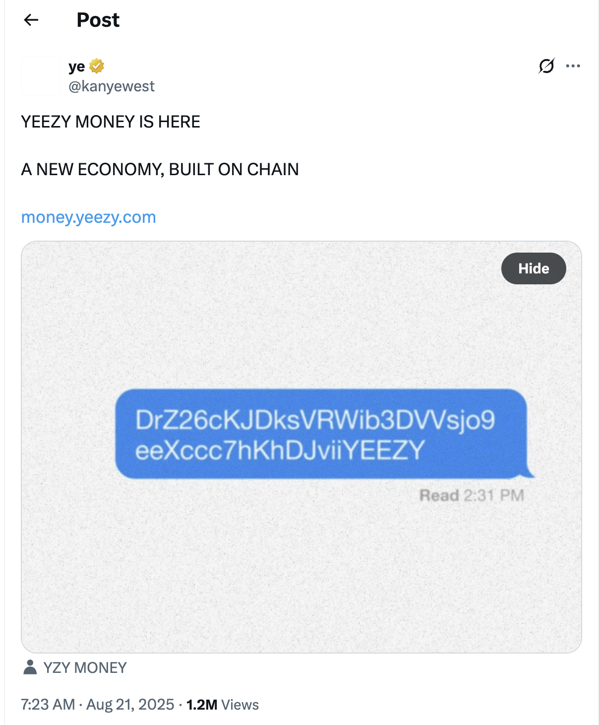 “YZY Money adalah konsep untuk memberi Anda kendali, bebas dari otoritas terpusat,” terang situs web tersebut.